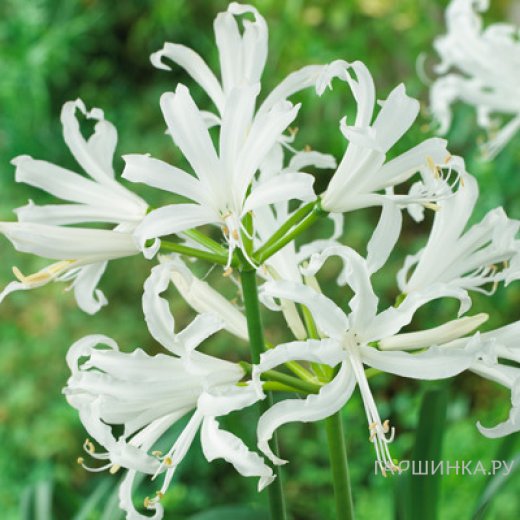 Нерине Боудени белая - невероятно красивое растение с необычными крупными белыми цветками. Многолетнее луковичное растение высотой до 45 см. Цветки крупные, белые, собраны в зонтиковидные соцветия. Цветет осенью.