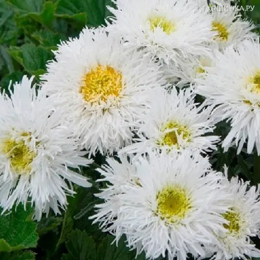 Ромашка (Нивяник) Крейзи Дейзи - имеет махровые или полумахровые цветки. Лепестки сильно рассеченные, белые. Формирует куст высотой до 70 см. Цветки до 8 см в диаметре. Цветет обильно и продолжительно, с июня по август.