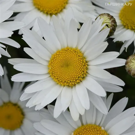 Ромашка (Нивяник) Мадонна - высота 25 см, диаметр цветка 7 см. Многолетнее растение. Нижние листья являются лопатчатыми, а верхние – продолговатыми. Лепестки чистого белого цвета собраны вокруг золотисто-жёлтого диска. Очень компактный куст. Тёмно-зелёная листва. Место для посадки необходимо выбирать солнечное. Почва: Суглинистая. Характер роста побегов: Прямостоячие. 4 зона зимостойкости.