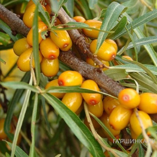 Облепиха Желтоплодная - Куст средне- и сильнорослый с полураскидистой кроной. Побеги длинные, толстые, прямые, коричневые, практически без колючек.