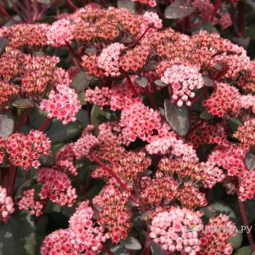 Очиток (седум) Ред Спаркл - Стелющийся многолетник высотой 30-40 см. Сине-зеленые листья постепенно переходят в пурпурно-фиолетовые. Цвеки розовые, собраны в зонтики. Цветет обильно с августа по октябрь.