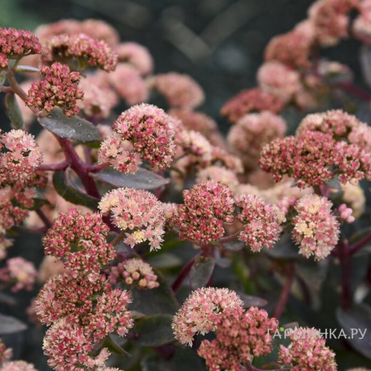 Очиток (седум) Рокн Гроу Тирамису - это травянистое суккулентное низкорослое растение семейства Толстянковые. Высота растения до 40 см. Листья зубчатые, средней величины, продолговатые, блестящие, красно-коричневые. Эффектные бледно-красные соцветия подчеркивают красоту листвы. Период цветения с июля по сентябрь.