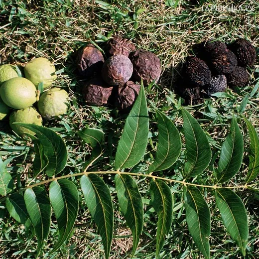 Орех черный - Ствол дерева имеет темный цвета, с глубокими бороздами. Может вырасти до 40 -50 метров в высоту. Широкая крона, опущенная книзу, имеет сводчатую форму. Ее размер равен высоте самого дерева, но нередко может быть и больше. Корни уходят глубоко в землю, усыпаны глубокими трещинами. Хорошо выражен главный корень, имеющий форму стержня. Светло-зеленые листья большого размера, длиною в 25 — 50 сантиметров. Цветение и распускание листьев приходится на один и тот же период. Первые плоды появляются, когда растение достигает 7 – 10-летнего возраста. У плодов скорлупа достаточно твердая, не всегда даже с помощью молотка ее можно расколоть.