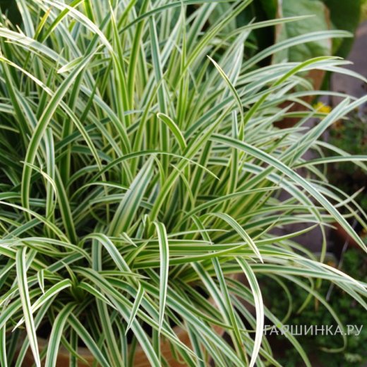 Осока Морроу Вариегата - низкорослый вечнозеленый многолетник. Образует куст высотой до 20 см, диаметром до 35 см. Листья узкие, с белыми полосками по краям. Цветет в июне-июле.