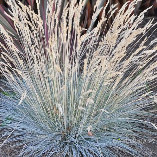Овсяница Санрайз сизая - декоративный многолетний злак, при росте образующий пышные, но компактные кусты. Они формируются узкими листьями темно-зеленого цвета, которые осенью меняют свою окраску и становятся оранжево-медными в верхней части. Соцветия высокие, до 70 см., метельчатые, состоят из мелких невзрачных цветочков бежево-коричневого оттенка. Высота куста без соцветий — до 30 см. Сорт предпочитает солнечное место, но также может быть размещен в полутени.Нетребователен к почвам, засухоустойчиво, не терпит переувлажнений.