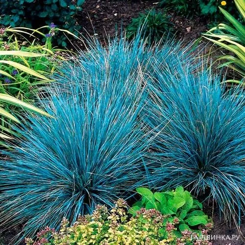 Овсяница сизая - Пользуется наибольшей популярностью из всех представителей семейства. Достигает в высоту всего 30-60 см, формирует очень пышный, густой и почти идеально сферический кустик из линейных, узких и жёстких листьев. Распускающиеся над ними серые метелки на прямых цветоносах мягкие, нежные и в целом неприметные, подчеркивают шаровидную форму куртинок.