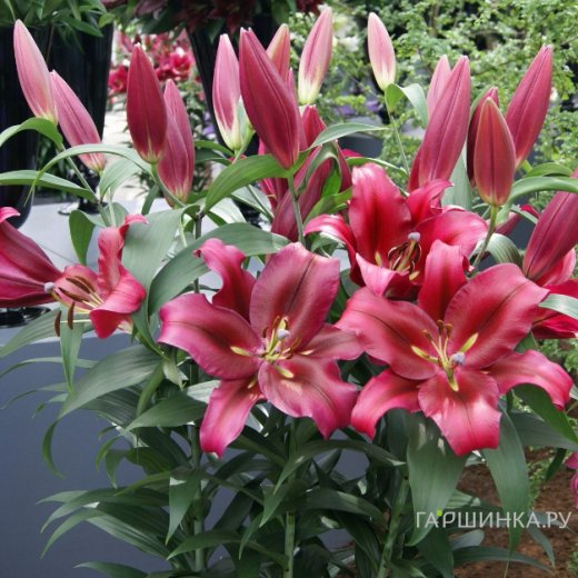 Лилия Палаццо ОТ-гибрид темно-розовая - Цветки диаметром 22 см, малиново-красные, направлены вверх или в сторону. Зацветает в июле-августе. Имеет сильный аромат. Высота растения 120 см.