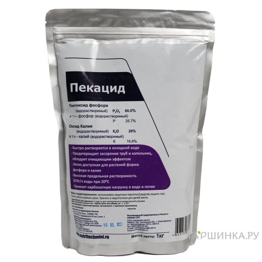 Пекацид 0-60-20- фосфорно-калийное удобрение, предназначенное для использования в системах капельного орошения. Он сильно подкисляет воду (рН 2,2) и при этом является высококонцентрированным источником фосфора и калия. Благодаря этим свойствам кроме питания, замечательно очищает системы капельного полива и капельные линии любого типа.