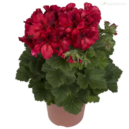 Пеларгония королевская Элеганс Фрэнни – многолетнее растение. Высота 50 см. Соцветие из 3-7 красных с темно-бордовой серединкой цветов, окраска насыщенная, диаметр 5 см. Цветение раннее, продолжительное, круглогодичное.