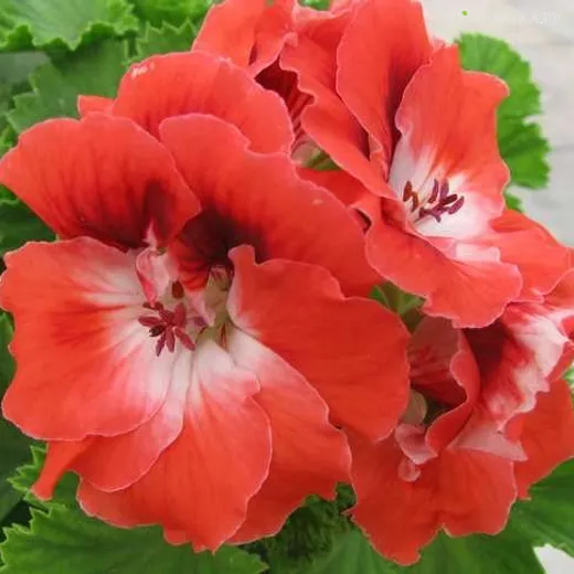 Пеларгония королевская Мандарин – многолетнее растение. Цветки крупные, полумахровые оранжевые цветы с тонкой белой волнистой карандашной каймой. На верхних лепестках красно- коричневые пятна, переходящие в ажурную сеточку. Основание цветка с широким белым горлом, на нижних лепестках по белому темно – коричневые штрихи.