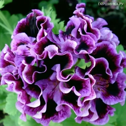 Пеларгония королевская Рембранд - Крупные волнистые цветы темно-бордового тона с широкой сиреневой волнистой окантовкой.