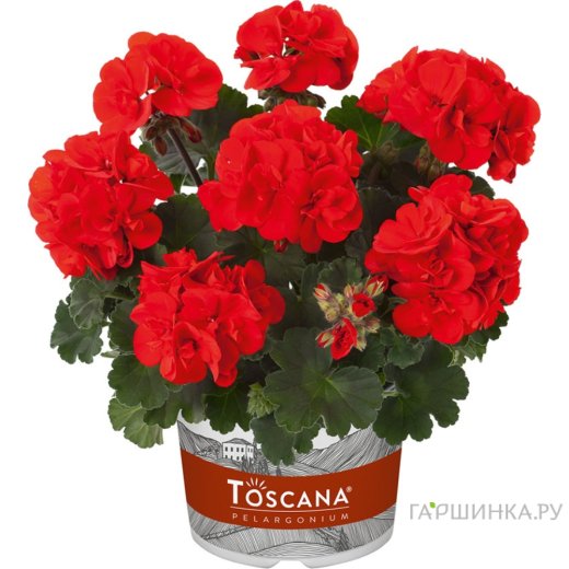 Пеларгония зональная Toscana Castello Red - Великолепный яркий сорт, так же известный как CASTELLO ERIK. Формирует хорошо ветвящийся, компактный, красивый куст шаровидной формы. Цветки полумахровые, насыщенного алого оттенка, ярко контрастируют с темной зеленой листвой. Цветение раннее, обильное и продолжительное.