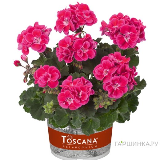 Пеларгония зональная Тоскана Кастелло Роуз Ай - Великолепный яркий сорт, так же известный как CASTELLO TAMMO. Формирует хорошо ветвящийся, компактный, красивый куст правильной формы, с сильной здоровой листвой. Цветки полумахровые, двухцветные, розово-красные с белым глазком. Цветение раннее, обильное и продолжительное.
