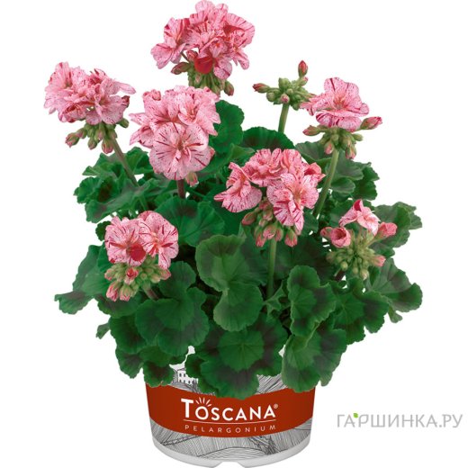 Пеларгония зональная Toscana Flic Flac Violet Nova - Формирует компактный, красивый куст шаровидной формы. Цветение раннее, обильное и продолжительное. Цветки очень интересной окраски, крупные, полумахровые, фиолетово-белые в крапинку.