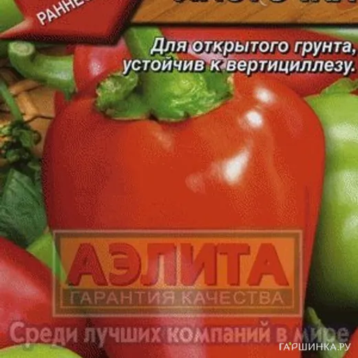 Сорт раннеспелый, для открытого грунта. Растение штамбовое, полураскидистое, высотой 50-60 см. Плоды одиночные, конусовидной, слегка овальной формы, гладкие. Масса плода 50-90 г, толщина стенки - 5-5,5 мм. Окраска в технической спелости - салатовая, в биологической - красная. Урожайность 2,5-4,5 кг/м2. Отличается дружностью созревания, устойчивостью к вертициллезному увяданию, повышенной лежкостью и транспортабельностью плодов.