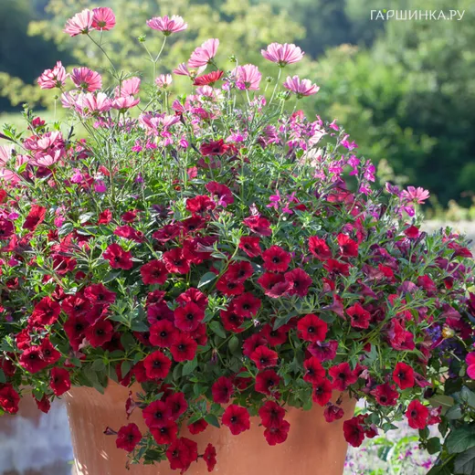 Петуния Изи Вейв Ред Велюр ампельная - каскадный гибрид, ниспадающие ветви которого в период цветения плотно усыпаны бутонами, создающими эффект пышного цветочного облака. Растение этого сорта характеризуется быстрым ростом гибких, рослых и сильно ветвящихся стеблей. Низкорослый куст всего 15 см в высоту, при этом длина его плетей достигает 80 см. В период цветения сильные, устойчивые к ломкости побеги густо покрываются многочисленными яркими соцветиями. Простые цветки – до 7 см в диаметре, окрашены в насыщенно-красный цвет с темной серединкой. Благодаря такому строению куста растение прекрасно смотрится в садовых вазах и подвесных корзинах. Кусты имеют хорошую устойчивость к засухе, и хорошо переносят неблагоприятные погодные условия.