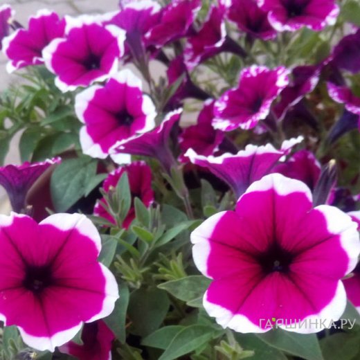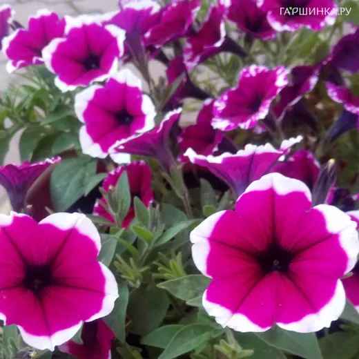 Цветки довольно крупные, окрашены в насыщенно-пурпурный оттенок с белоснежной тонкой каемкой. Чашелистики небольших размеров, до 4-6 сантиметров. Из-за огромного количества цветков образовываются плотные шапочки, состоящие из воронковидных бутонов, которые со временем могут активно распускаться. Благодаря этому они хорошо защищены от неблагоприятных погодных условий.