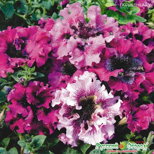 Уникальная петуния, которую невозможно отнести ни к одной из известных групп этого растения. Огромные, до 12 см в диаметре цветки иимеют сильно гофрированный нежный кружевной край и очень жесткий, почти "пластиковый" более темный центр, который их поддерживает! Это создает уникальный для цветов эффект "кринолина" - когда большой цветок достаточно устойчив к дождю и непогоде. В отличие от ранее встречаемых похожих петуний, имеет компактные растения, что делает ее декоративность непревзой