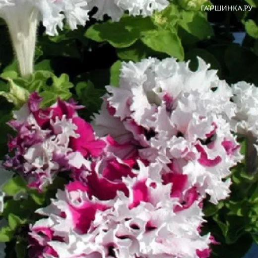 Относится к группе крупноцветковых, бахромчатых петуний. Высота растений 35-40 см. Образует аккуратный, привлекательный куст диаметром 65 см. Цветет с июня до заморозков. Цветки крупные, трубчатые, диаметром 6-7 см, с бахромой на концах лепестков. Окраска неоднородная: розовые и фиолетовые пятна на белом фоне. Махровость обнаруживается у 50% растений.