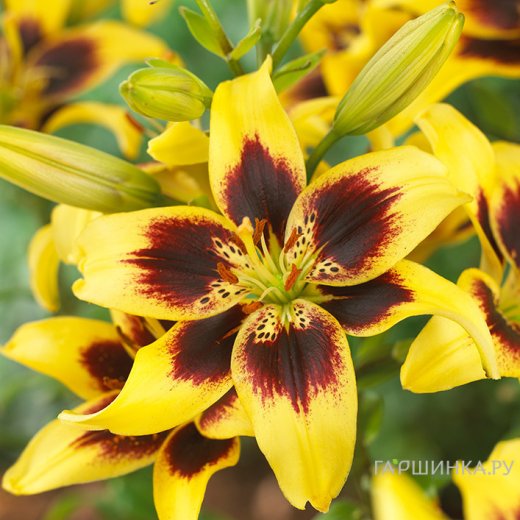 Лилия Пиетон азиатская - Цветок с ярко-желтыми лепестками и темно-бордовыми пятнами у основания лепестков. Высота растения 110 см. Цветки лилии 17 см в диаметре. Без запаха. Период цветения июнь-июль.