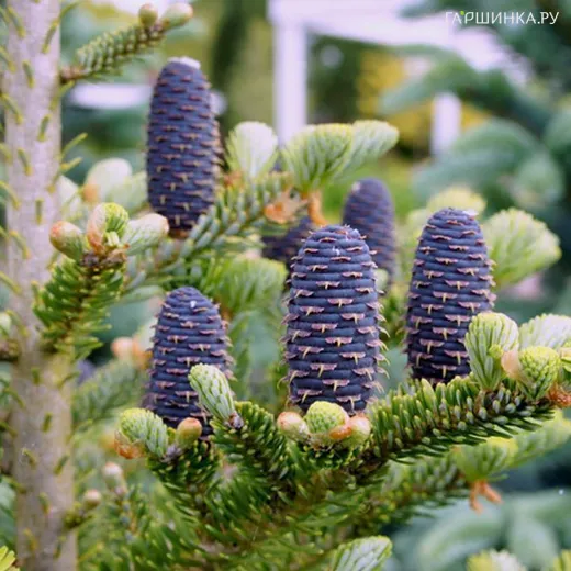 Пихта корейская Блю Стандарт - Пихта ширококонической формы. Вначале растёт медленно, к 10-ти годам высота 175 см и ширина 75 см. Конечная высота 5-7 м. Хвоя серебристо-серая, контрастирующая с фиолетово-синими шишками. Место солнечное или полутенистое. Почва дренированная. Морозостойкость до -27°С.