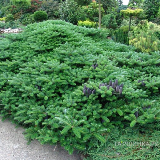 Пихта корейская Грин Карпет - Низкий, раскидистый сорт с подушковидной формой кроны. Примерная скорость роста составляет 5 см в год. Хвоя ярко-зеленая весной, при созревании становится темно-зеленой. К 10 годам вырастет до 60 см в высоту и 180 см в ширину. На растении образуются многочисленные эффектные пурпурные шишки, ярко контрастирующие с листвой. Молодые растения в первые годы посадки требуют укрытия. С возрастом зимостойкость повышается.