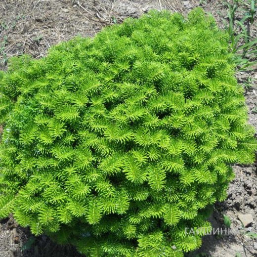 Пихта корейская Тундра - карликовая форма пихты корейской. Карликовый кустарник с симметричной густой подушковидной кроной, до 40 см в высоту и до 60 см в диаметре. Растет очень медленно, почти не нуждается в обрезке – форма сохраняется долго. Хвоя короткая, мягкая, блестящая, насыщенного зеленого цвета, с нижней стороны серебристая. Молодые приросты ярко-зеленого цвета. Не меняет окрас хвои в зимний период.