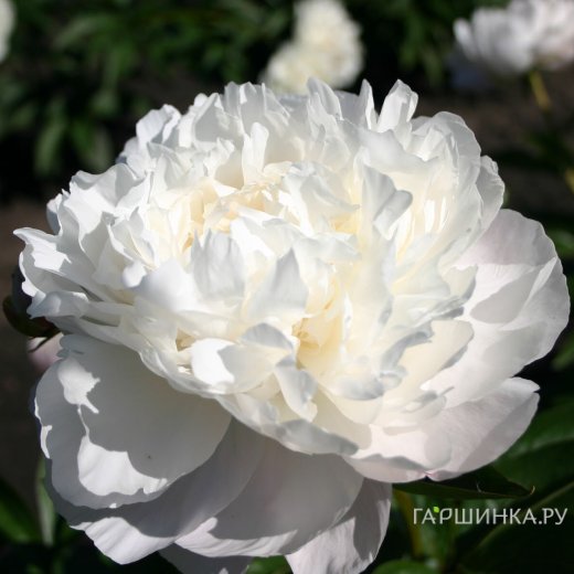 Полураскидистый кустарник достигает в высоту 80–90 см и формирует мощные, прочные побеги, которые не нуждаются в подвязке. Листья крупные, глянцевые, насыщенного зелёного цвета, создают декоративный фон даже вне периода цветения. Цветки у пиона Амалия Олсон махровые, корончатой формы, диаметром около 20 см. При распускании бутоны окрашены в бело-розовый тон, позже они превращаются в белоснежные густые шары с бархатистой текстурой лепестков и редкими красноватыми штрихами на обратной стороне.