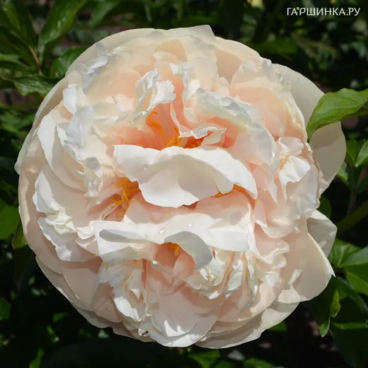 Пион Блонд Вижн - гибридный пион среднераннего срока цветения. Цветки густомахровые, очень красивой окраски. При роспуске бутон имеет светло кремово-коралловый оттенок, затем при большем открытии цветка постепенно теряет коралловые оттенки и переходит в светло-желтые. После полного раскрытия окраска двухцветная: снаружи лепестки светло-желтые, а внутри розово-коралловые. Диаметр цветка 16-17 см. Куст раскидистый высотой до 75-80 см. Побеги прочные, толстые. Листья сочного зеленого цвета. Цветение в июне. Аромат отсутствует. Зона зимостойкости 4.