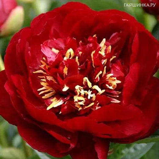 Пион Бакай Белл - Махровый, розовидный. Тёмно-красно-коричневый с крупными контрастными тычинками. На прочных стеблях до 3 бутонов. Тонкий аромат. Цветение продолжительное, с июня по июль. Высота: 80-90 см. Размер цветка: 18 см. Зона зимостойкости: 3 (-40 ° С)