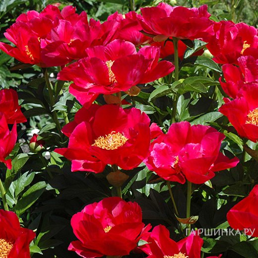 Пион Карина - гибридный сорт. Цветок полумахровый, чашевидный состоит из 2-3 рядов лепестков. Цвет ярко-красный, блестящий, с маленьким центром из жёлтых тычинок. Диаметр цветка 16 см. Куст сильный высотой 75 -90 см. Цветение обильное в ранне-средние сроки. Устойчивый к заболеваниям, неприхотливый сорт. Идеально подходит для срезки. Зона зимостойкости 4.