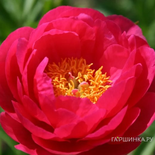 Цветок полумахровый, цвет малиновый, в диаметре до 16 см. Листья светло-зеленые. Высота взрослого растения до 65 см.