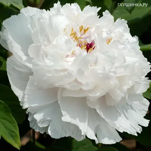 Пион Ароматный Нефрит древовидный белый - цветок махровый корончатый, диаметром 20 см, белый. Лепестки блестящие, плотные. Цветок смотрит вверх. Листья большие. Высота до 2 м. Сорт хорошо растёт на щелочных почвах и любит солнечные места. Срок цветения поздний.