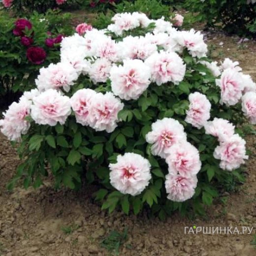 Пион Белый снег древовидный белый - цветок махровый корончатый, 20 х 7 см, белый, блестящий, с фиолетовым оттенком ближе к основанию лепестков. Листья крупные. Цветки смотрят вверх. Цветение обильное, в поздние сроки. Высота до 2 м. Хорошо растёт на солнечных местах.