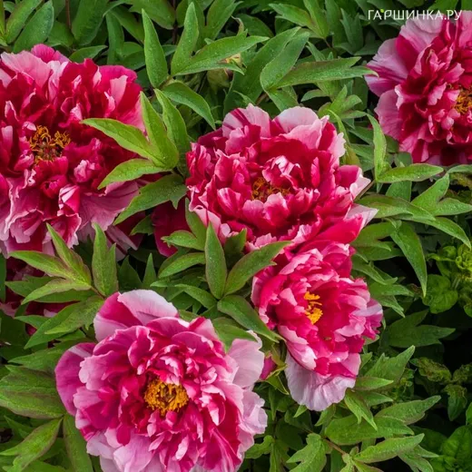 Пион Инь и Янь древовидный многоцветный - цветок диаметром 15-16 см, полумахровый, красного, белого или смешанных цветов. Все три варианта окраски могут быть одновременно на одном растении. Лепестки вогнутые. Листва зелёная, слегка бронзоватая. Забавный сорт, который каждый год дарит очаровательный сюрприз.