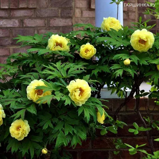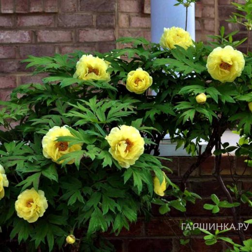 Пион Полуденный Зной древовидный желтый - имеет высоту от 150 до 200 сантиметров, поэтому вполне может считаться высокорослыми. Прямостоячие побеги весьма морозостойки, облиственность у них обильная. Декоративность кусту в моменты отсутствия цветения обеспечивает глянцевая ажурная листва зеленой расцветки. Осенью перистые листочки приобретают красивый багряно-красный окрас. Цветет культура обильно, ярко и пышно. Один древовидный пион формирует на себе около 70 крупных цветков.