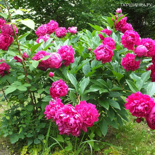 Пион древовидный Пурпурный Феникс - многолетний листопадный кустарник высотой 150-200 см. Цветки крупные, пурпурно-красные диаметром 15 см. В центре цветка крупные желтые тычинки. Молодой куст цветет темно-розовыми бутонами, но по мере взросления растения цветы приобретают насыщенный пурпурный оттенок. Стебли покрыты ажурной ярко-зеленой листвой. Цветение обильное с июня и продолжается 14-18 дней. Прекрасно смотрится в одиночных и групповых посадках.