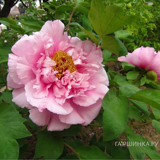 Пион древовидный Розовая точка - цветки темно-розовые, розовидные. Куст высотой 100-150 см. Срок цветения средний. Морозоустойчивый кустарник, достигающий высоты до 2 м, с крупными ярко-зелеными листьями. В отличие от травянистого пиона стебли такого растения в осеннее время не увядают, а с каждым годом разрастаются все больше, и со временем кустик приобретает полушаровидную форму. На одном кусте может быть от 30 до 70 цветков. Диаметр каждого от 15 до 18 см. Продолжительность цветения 12—14 дней. Растение декоративно и после цветения из-за необычной формы листьев.
