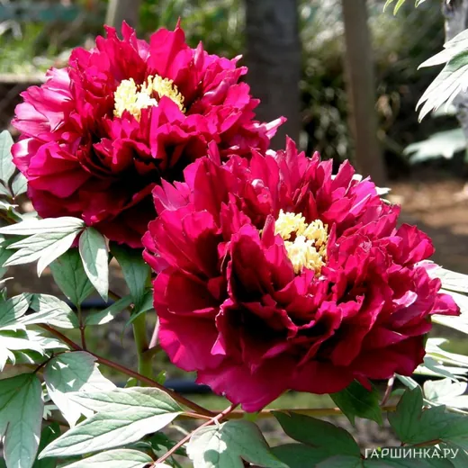 Пион древовидный Сад в розовом сиянии - махровые цветы короновидной формы диаметром до 16 см. с приятным ароматом. Лепестки малиново-пурпурные, тычинки жёлтые. Цветоносы крепкие. Листья крупные, сложные, дваждыперистые, летом зелёные, осенью приобретают красно-пурпурный цвет. Пурпурно-красные цветы, корончатой формы, 16 см в диаметре. Куст сильнорослый со множеством цветов. Высота 150 см.