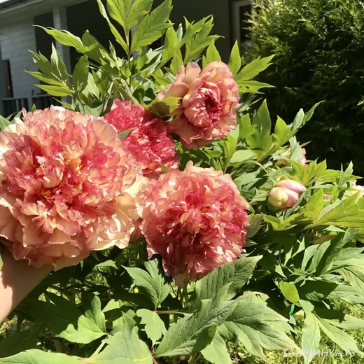Пион Золотая Россыпь древовидный желтый - куст до 150 см, активно и быстро набирает лиственную массу. Ветви прямые. Листва обильная, крупная, ярко-зеленая, способна играть самостоятельную декоративную роль благодаря красиво изрезанной форме. В ширину и в высоту в первые годы куст достигает 1,2 метра, смотрится относительно компактным на фоне других древовидных кустов, сравним по размерам с кустовыми розами. Цветки очень крупные, густомахровые, до 17 см, по некоторым данным, до 20-25 см, корончатой (ярусной) формы. Лепестки имеют интересную особенность: край чуть изрезанный, волнистый, подчеркнут тонкой розовой каймой пикоти, с легкими акварельными мазками, перетекающими в основной тон. Основной цвет лепестков – золотисто-желтый. К центру лепестки уменьшаются, поэтому розоватый цвет сгущается. Благодаря игре красок издали цветы выглядят теплыми, абрикосовыми. В центре иногда видны видоизмененные тычинки, похожие на толстые ярко-золотые нити. Весь цветок производит волшебное впечатление – будто сложен из дорогого китайского шифона. Цветы источают красивый утонченный аромат.