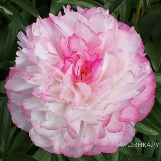 Цветки махровые, лепестки имеют розовый оттенок, затем середина начинает светлеть, по краю лепестков идет четкая розовая кайма.