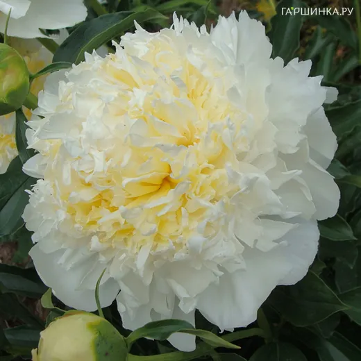 Пион Хани Голд. Высота 90-100 см, диаметр цветка 17 см. Срок цветения средний (май-июнь). Махровый, корончатый. Внешние крупные округлые лепестки бело-кремовые, внутренние золотисто-желтые, мелкие и рассеченные.