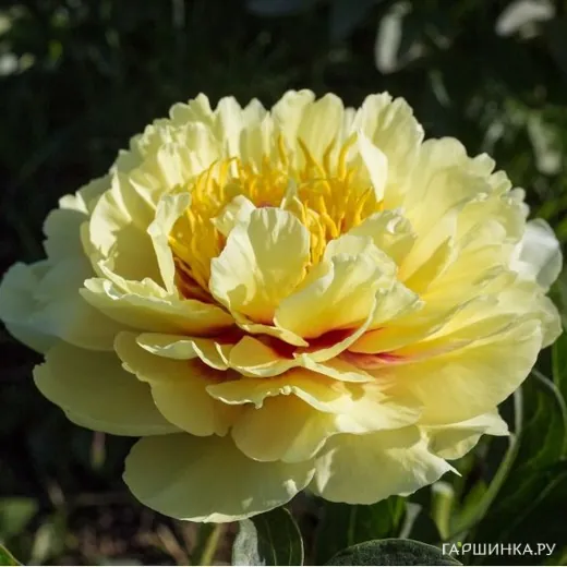 Пион Гаден Треже (ИТО) - высота 0,75 м, рост быстрый. Окраска полумахрового шелковистого цветка золотисто-желтая с небольшими алыми пятнами, 20 см, тычинки желтые, лист темно-зеленый, глянцевый. Присутствует сильный аромат, по сроку цветения - средний.