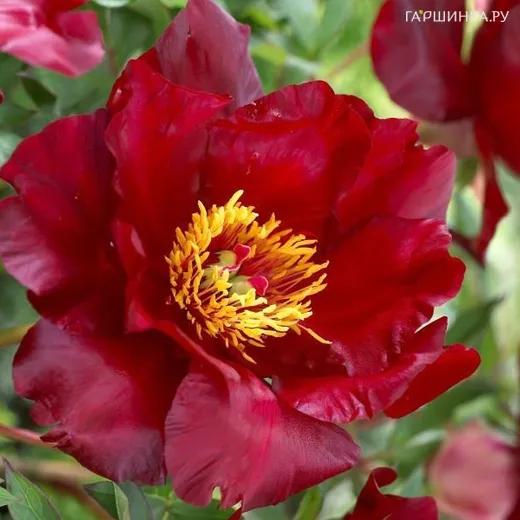 Пион Скарлет Хевен (ИТО) - высота 0,75 м, рост быстрый. Окраска полумахрового шелковистого цветка глубоко алая, 23 см, тычинки желтые, лист темно-зеленый, глянцевый. Присутствует легкий аромат, по сроку цветения - средний.