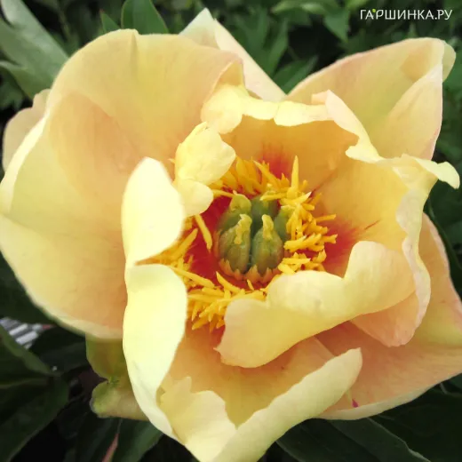 Цветок махровый, лимонный с красными пятнами у основания лепестков. Диаметр до 18 см. Листва темно-зеленая.