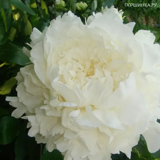 Пион Миссис Ж.В. Эдлунд (Paeonia Mrs. J. V. Edlund) - Махровый розовидный. Цветок белый. Аромат слабый. Срок цветения очень поздний. Цветение продолжительное. Очень поздний. Высота: 80-90 см. Размер цветка: 18 см. Зона зимостойкости: 3 (-40 ° С)