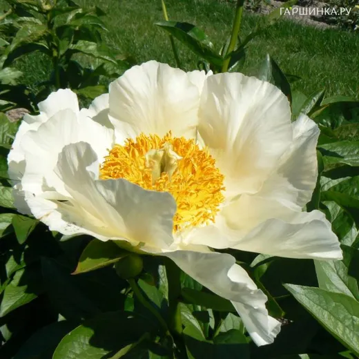 Пион Мунрайз - травянистое растение. Раннецветущий, эффектный сорт. Цветение начинается с мая. Цветки с округлыми лепестками цвета слоновой кости, в центре множество ярко-желтых тычинок. Цветок крупный диаметром до 20см. Куст раскидистый, высотой 80-100 см. Стебли крепкие, прямостоячие. Листья крупные, зелёные. Аромат слабый. Подходит для срезки. Зона морозостойкости 4.