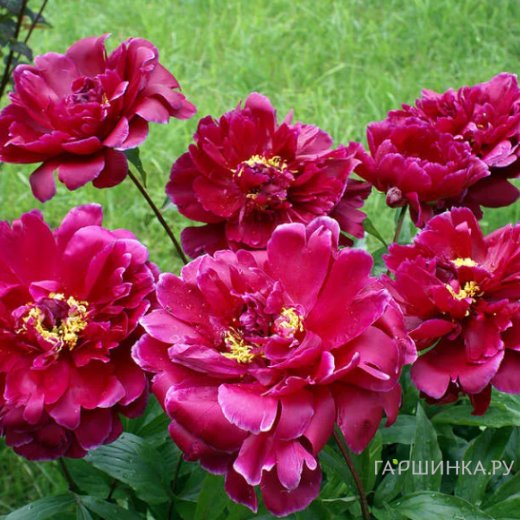 Пион Питер Бренд (Paeonia Peter Brend) - Махровый, розовидный. Темно-рубиновый с атласным блеском и золотистыми тычинами, в конце цветения коричневый. На прочных стеблях до 3 бутонов. Тонкий аромат. Цветение продолжительное, с июня по июль. Зона зимостойкости: 3 (-40 ° С)