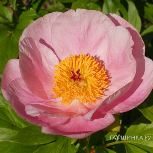 Цветки тёплого розового цвета с жёлтыми тычинками. Листья большие.
