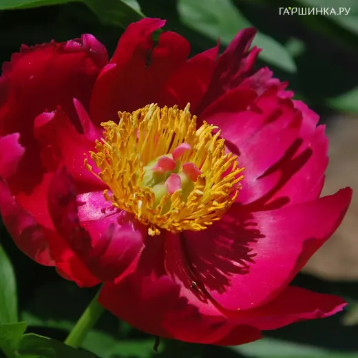Цветок немахровый, алый. Диаметр до 18 см. Листва темно-зеленая.